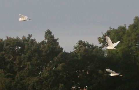 The major highlight of the month was the first-ever record of cattle egret here, and it was a record that could very easily have been missed. A northbound flock of nine egrets which were assumed to be little egrets flew over on the 29th. When news filtered through that a flock of egrets which passed over Walthamstow Wetlands about ten minutes later appearing to have one bird with a yellow bill (denoting adult cattle egret) came through, it warranted a good look through photos of the egret flock taken here. Sure enough, the flock did contain an adult cattle egret (upper right bird in picture below), but also a juvenile cattle egret (top left).
