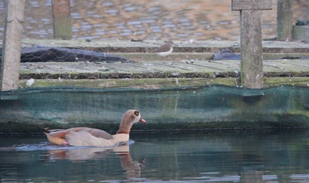 Common sandpipers are mostly seen over the road on the concrete banks of the West Reservoir but could sometimes be seen flying around here and occasionally landing on one of the tern rafts (below being inspected by an Egyptian goose).