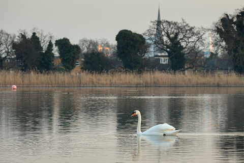 Swan on the surface of a reservoir with reeds and trees in the background.