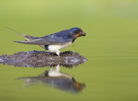 The swallow, or 'barn swallow', is a common summer visitor, arriving in April and leaving in October. It builds mud and straw nests on ledges, often in farm buildings and outhouses, or under the eaves of houses. Swallows are widespread and common birds of farmland and open pasture near water. They are agile fliers, feeding on flying insects while on the wing. Before they migrate back to their wintering grounds in Africa, they can be seen gathering to roost in wetlands, particularly reedbeds.How to identify