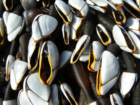 Goose barnacles live attached to rocks, ships, ropes or flotsam floating out at sea. They've even been spotted on a chunk of spaceship that washed up in the Isles of Scilly! They are also known as a gooseneck barnacle and have a long fleshy stem that looks like a black neck. The stem or peduncle is topped with a chalky white shell that houses the main body of the barnacle.Barnacles are a type of crustacean, related to crabs and lobsters. Goose barnacles filter feed on plankton and detritus, capturing it from the water with their specially adapted legs. In many places in the world they are a delicacy - in fact, in days gone by, any ships arriving in Cornwall with goose barnacles on the hull were a real moneyspinner. The goose barnacles would be scraped from the hull and sold for food.