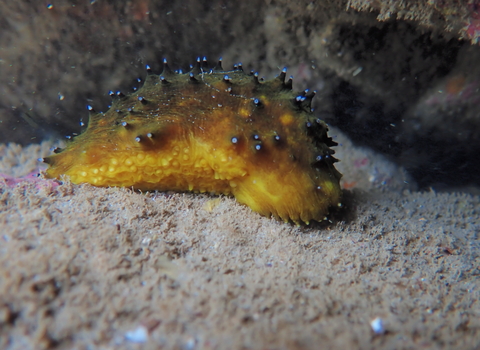 Although they might not look it, sea cucumbers like this one belong to the Echinoderm group and are therefore closely related to starfish and sea urchins